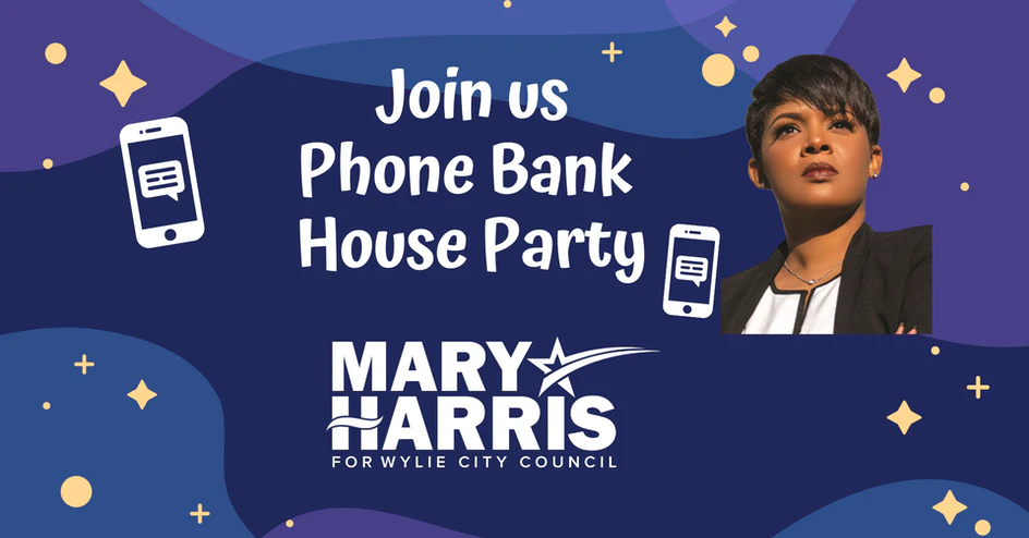 Come out to support Mary Harris, candidate for Wylie City Council! She has two ways you can help out: Phone Banking and Block Walking! She has multiple dates available for both so pick a date that works and come out to help elect Mary to Wylie City Council!