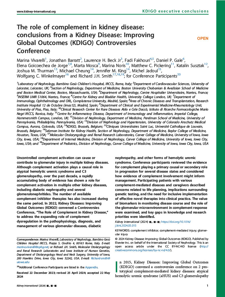 KDIGO recently announced the publication of The Role of Complement in Kidney Disease: conclusions from a Kidney Disease: Improving Global Outcomes (KDIGO) Controversies Conference in Kidney International. The final version of the conference report was released digitally in July and will be published in the September issue of the journal. Co-chaired by Marina Vivarelli, MD (Italy) and Richard Smith, MD (United States) in Florence, Italy, in 2022, the conference gathered leading nephrologists, researchers, patients, and caregivers to discuss the latest evidence and future directions for managing complement-mediated kidney diseases.