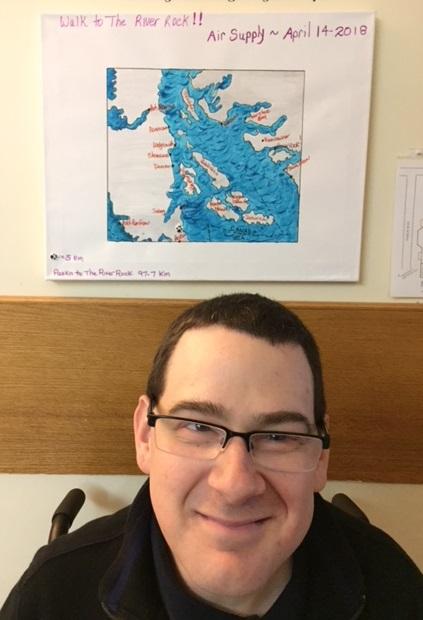 new visual goal tracking art; he tracks his steps and every time he walks 5km he adds a new paw print to the map. His goal is to walk the 97.7kms it would take to get to the River Rock Casino to see Air Supply in April of 2018