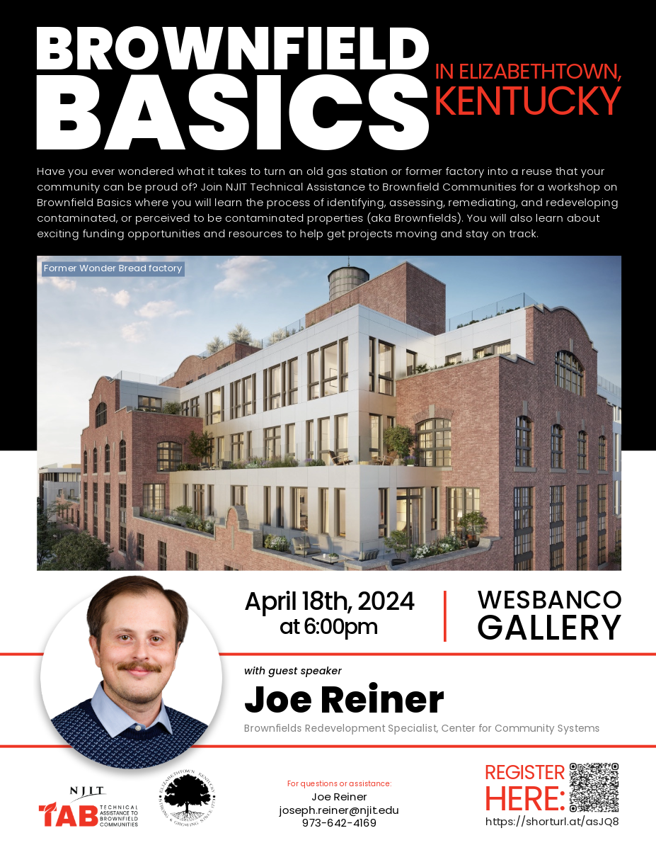 Brownfield Basics Workshop | Thurs. April 18 at 6PM | Elizabethtown, KY | Join us for a Brownfields Basics to learn the ABCs of brownfields redevelopment from national brownfields experts. During this in-person workshop, attendees will learn how to identify brownfields, and the benefits of embarking on the investigation and cleanup process; how to tap into federal, state, and local brownfields programs and resources; and how to obtain free technical assistance from NJIT Technical Assistance to Brownfield Communities (NJIT TAB). | |