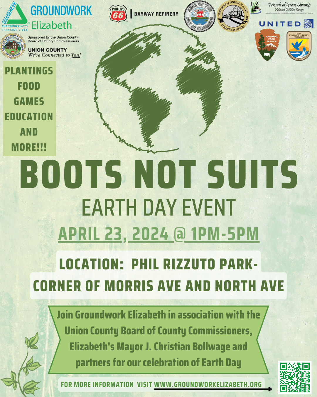 Earth Day is around the corner. Join Groundwork Elizabeth and partners during Earth Week at Phil Rizzuto Park on Tuesday, April 23rd for our Annual 'Boots not Suits’ community event. Help learn, plant, and improve our local environment. Look for other Earth Day celebrations, local to you for preceding events!