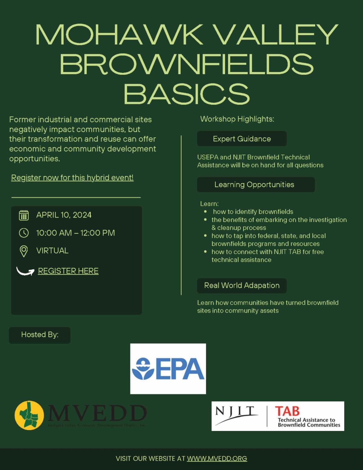 Mohawk Valley Brownfields Developer Summit Series | EPA's Mohawk Valley Roundtable: Monday, April 22 at 1PM | Herkimer, NY | This roundtable led by the US Environmental Protection Agency (EPA) will bring together a coalition of experts to teach attendees the basics of the EPA brownfields program and how to apply for various EPA grants. | Mohawk Valley Brownfield Developers Summit: April 23-24 | Herkimer, NY | The Brownfields Developer Summit started as a local effort to showcase the Mohawk Valley and brownfield remediation opportunities. This premiere event will spotlight redevelopment opportunities and provide the connection to meet local, state, and federal officials that are transforming the Mohawk Valley into a hub for regional revitalization. | Mohawk Valley EDD: Brownfields “Get Ready” Workshop on Thurs. April 25 at 9AM | Herkimer, NY | Join this "Get Ready" workshop focused on brownfield grant-writing to get a head start on preparing your submissions for federal, state and other available grant programs your community might be eligible for to move your brownfield redevelopment projects forward into community assets. | Brownfield Basics Virtual Workshop | Wed. April 10 at 10AM ET | # ICYMI: Kickstarting the summit, the Mohawk Valley Economic Development District gathered experts from the US EPA, NYS Department of State, NYS Department of Environment Conservation and NJIT TAB to provide a Brownfield Basics Virtual Workshop held April 10th. If you're new to brownfields, view the playback below to get up to speed to enjoy the many opportunities the Mohawk Valley Brownfield Developers Summit brings to communities. | Advanced BioRemediation Workshop | Thurs. May 9 | Edison, NJ | EnviroWorkshops are in-person half-day workshops for environmental professionals which take place all over the US and Canada. This particular event is being kicked off by our NJIT TAB's Executive Director, Dr. Colette Santasieri discussing "Transforming Brownfields into Community Assets" to set the stage and context for more specific remediation based sessions that follow. |