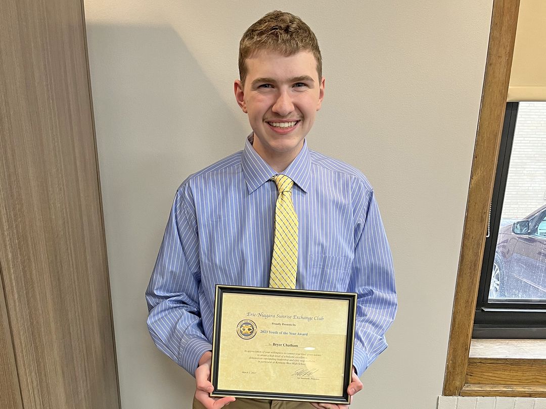 Kenmore West student Bryce Chatham was recently recognized as a Youth of the Year by the Erie-Niagara Sunrise Exchange Club. The award goes to a Kenmore West student each year who has made a positive impact on others. The Erie-Niagara Exchange Club, which meets weekly over breakfast, is a group of friends and neighbors who come together to find ways they can work to improve our community. Award recipients are typically those who exhibit leadership and community service. Bryce is a senior honors student who is in the aviation program and recently attained the rank of Eagle Scout. Congratulations Bryce!