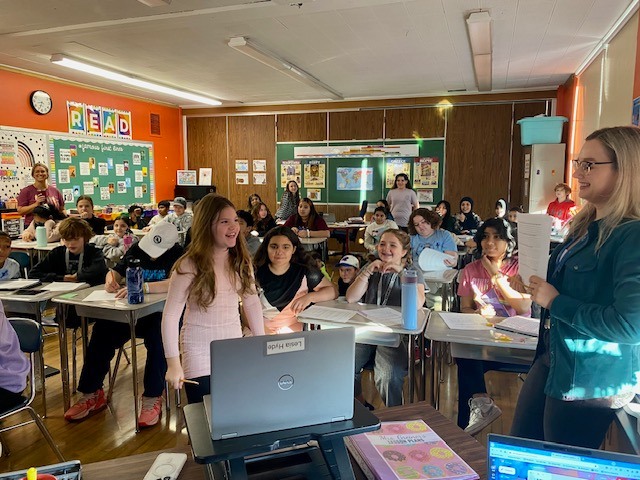 Sixth-grade students in Franklin Middle School teacher Katelyn Greiner's class recently had the opportunity to video chat and interview another sixth-grade class in Kropyvnytskyi, Ukraine. This was with the help of English as a New Language teacher Lesia Hyde, whose cousin teaches ENL in Ukraine. Students crafted interview questions about school life, academics, student culture, and hobbies, as well as what it's like going to school during the war. Volunteers asked/answered questions from each class and recorded their responses. FMS students were able to use the information from the interview to write about similarities and differences between both countries. This was a very humbling and exciting opportunity for both teachers and students alike.