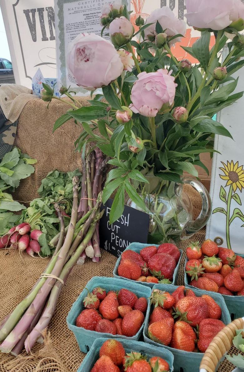This week's produce includes strawberries, raspberries (maybe), snap peas, asparagus, rhubarb, lettuce mixes, leaf lettuce, spinach, green onions, microgreens, radishes, turnips, kale (assorted varieties), mustard greens, spring garlic and fresh mushrooms as well as starter plants. Bunches of fresh herbs will also be available.