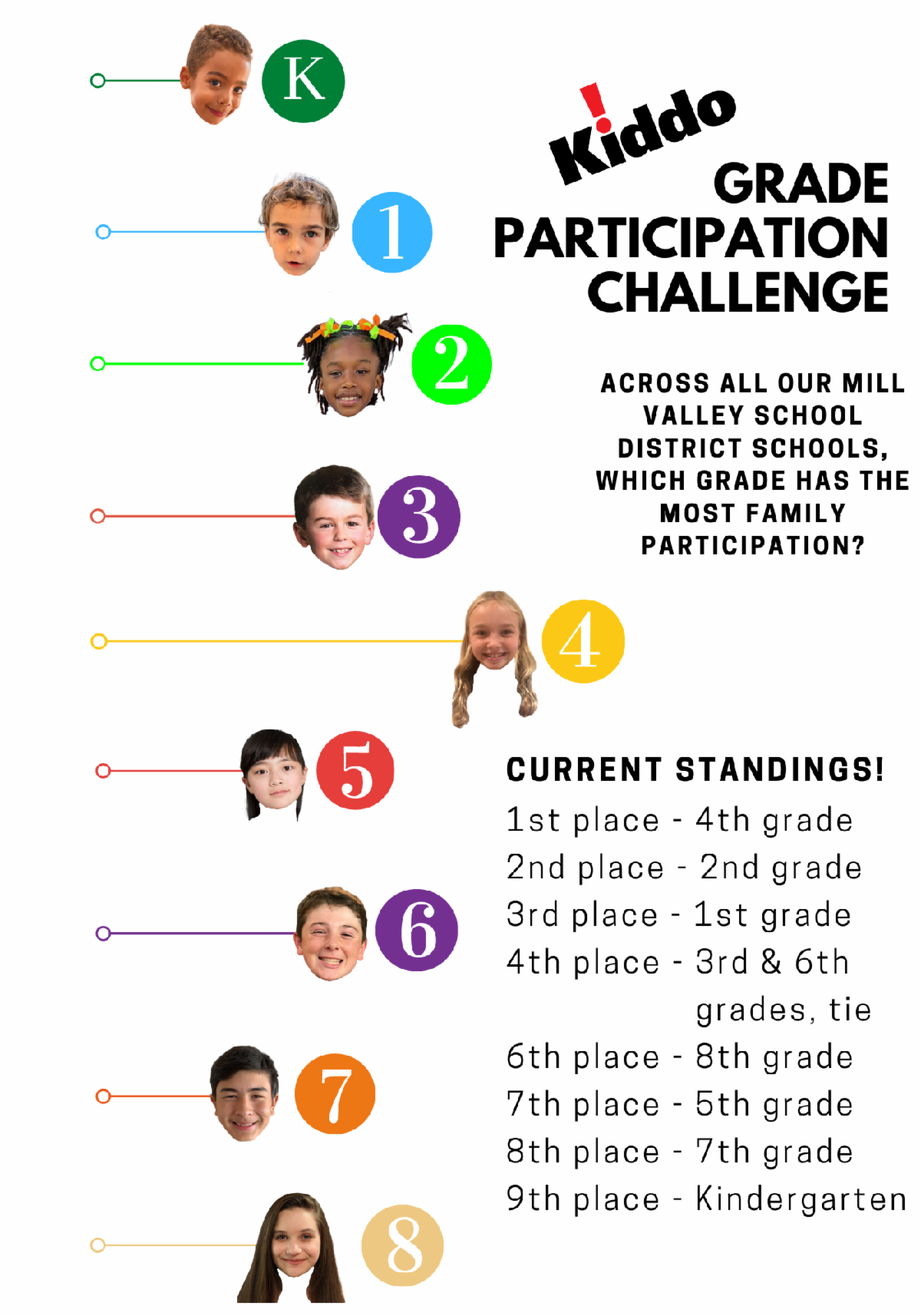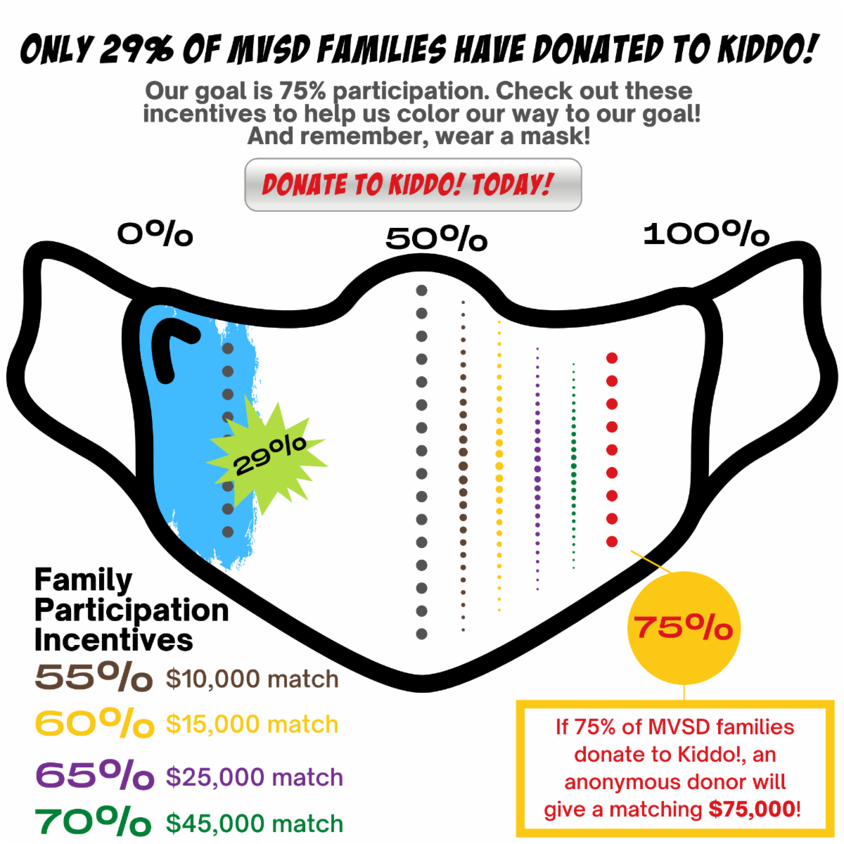 Challenge #1: We have an incredible matching opportunity from a few anonymous families. The higher our district-wide family participation, the higher the match, with the opportunity for Kiddo! to receive up to $75,000 in matching funds if we get to 75% participation.