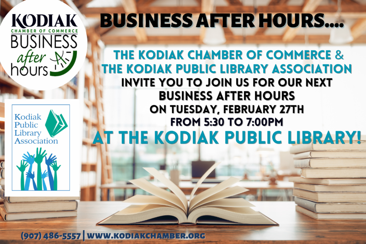 On Februray 27th we will hold our first Business After Hours of the Year at the Kodiak Public Library from 5:30-7:00pm we hope you'll join us there. In March we have two Business After Hours events scheduled, for Island Trails Network on March 20th and then one on the 29th at Kodiak College.