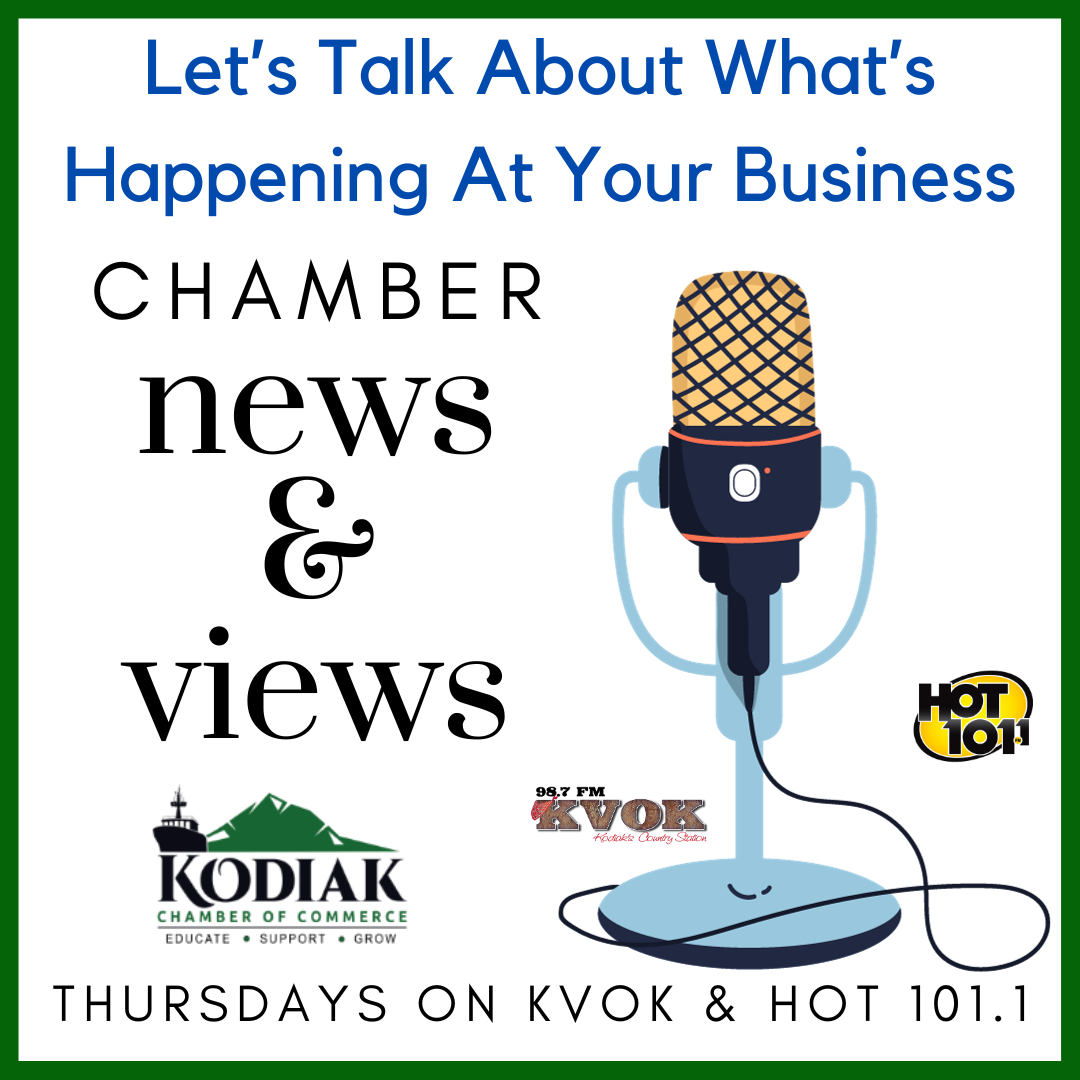 Please remember that if you have an event or sale coming up, a press release that you want to get out to our members, an open house or have some questions for ideas and plans you’re working on, be sure to reach out and talk with us or email us your flyer and information so we can share it with our membership. We are here to help. Our Small Business Collaboration Group Meets once a month, send me an email at ellen@kodiakchamber.org if you'd like to be a part of our monthly meetings. If you'd like to host a Business After Hours, if you're ready for a Ribbon Cutting Ceremony or you would like to record an interview on Chamber News & Views.