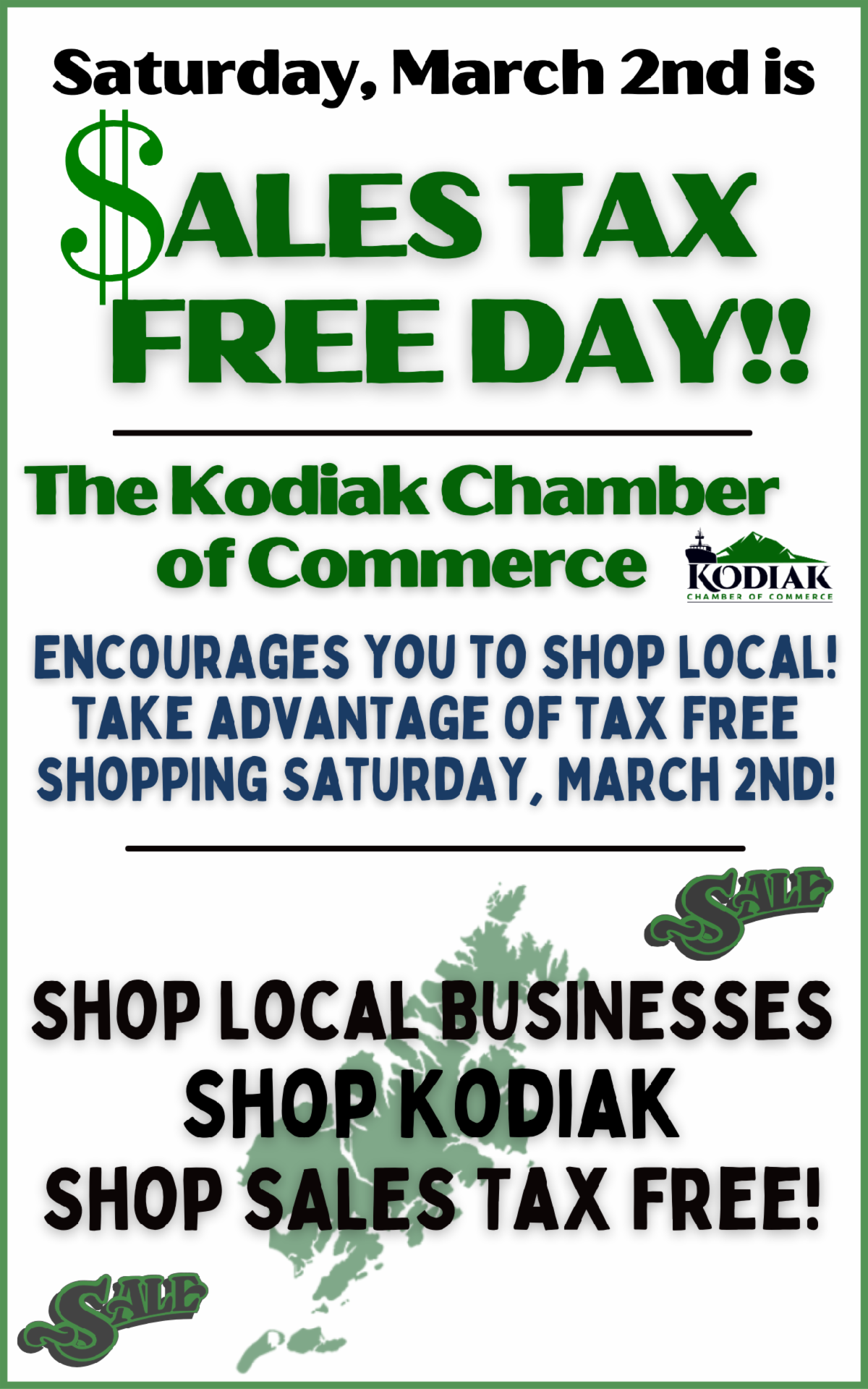 It has been refreshing to see so much hustle and bustle throughout our downtown over the past several months thanks to the opening of the Kodiak Marketplace and quite a few new businesses opening up in the downtown area recently. It appears as though our Kodiak businesses all across the community are busy and thriving. Sales Tax Free Day is Saturday, March 2nd this year and usual promises to be a busy day for local retail and business in Kodiak. Our gratitude and appreciation goes out to the City of Kodiak for encouraging and helping to incentivize Q1 local shopping to strengthen our economy.