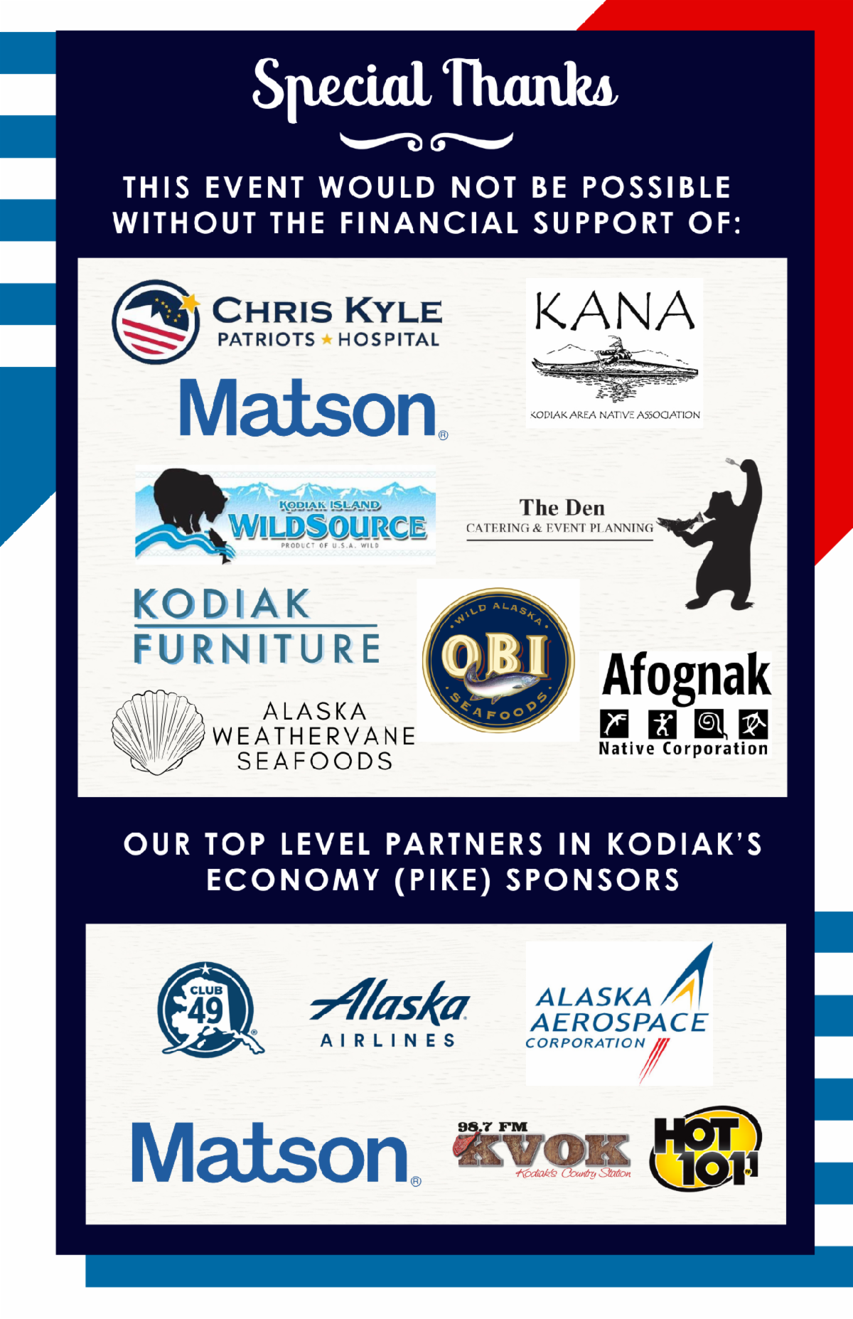 Big Thanks to our sponsors for the night: Chris Kyle Patriots Hospital, Afognak Native Corporation, KANA, Matson, and the Den Catering.