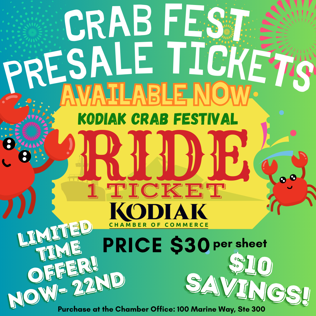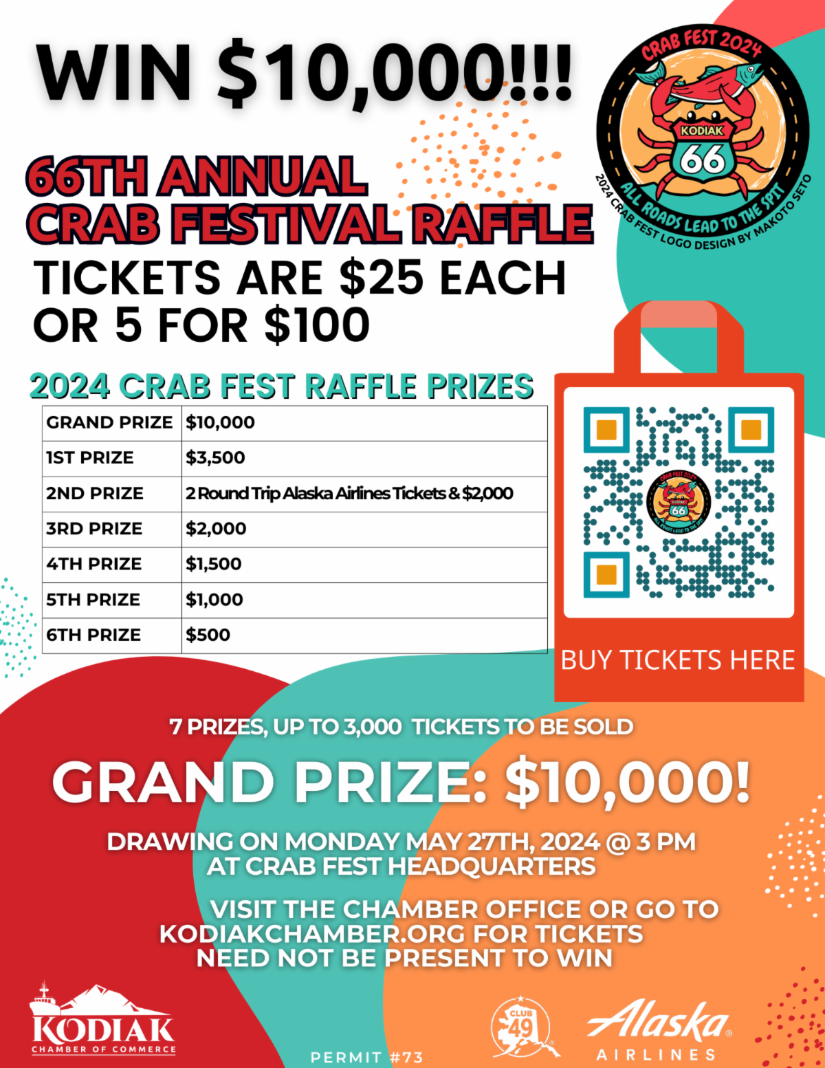 Winners will be drawn at 3pm on Monday, May 27th, 2024 downtown at our CrabFest Headquarters Booth 403 W Marine Way, Kodiak, AK 99615. Only 3,000 tickets available for purchase. You must be an Alaska Resident and 18 years or older. Tickets are also available through kodiakchamber.org or in person at the Kodiak Chamber of Commerce office 100 East Marine Way Suite 300; Kodiak, AK 99615. For questions call 907-486-5557.