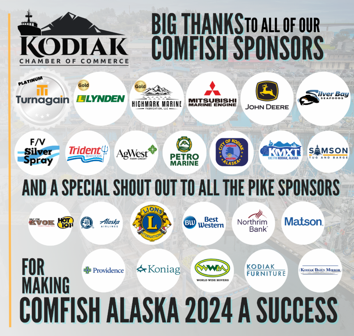 Thank you to our COMFISH PIKE Sponsors: World Wide Movers, Alaska Aerospace, KVOK HOT 101, Alaska Airlines, Lions Club, Best Western, Northrim Bank, Matson, Providence Kodiak Island Medical Center, Koniag, Kodiak Furniture, and the Kodiak Daily Mirror. Alaska Marine Conservation Council, Alaska Sea Grant, ASMI, Sitka Seafood Market, Kodiak Island WIldsource, and Kodiak Jig Seafoods, Association of Latin Women in Alaska.