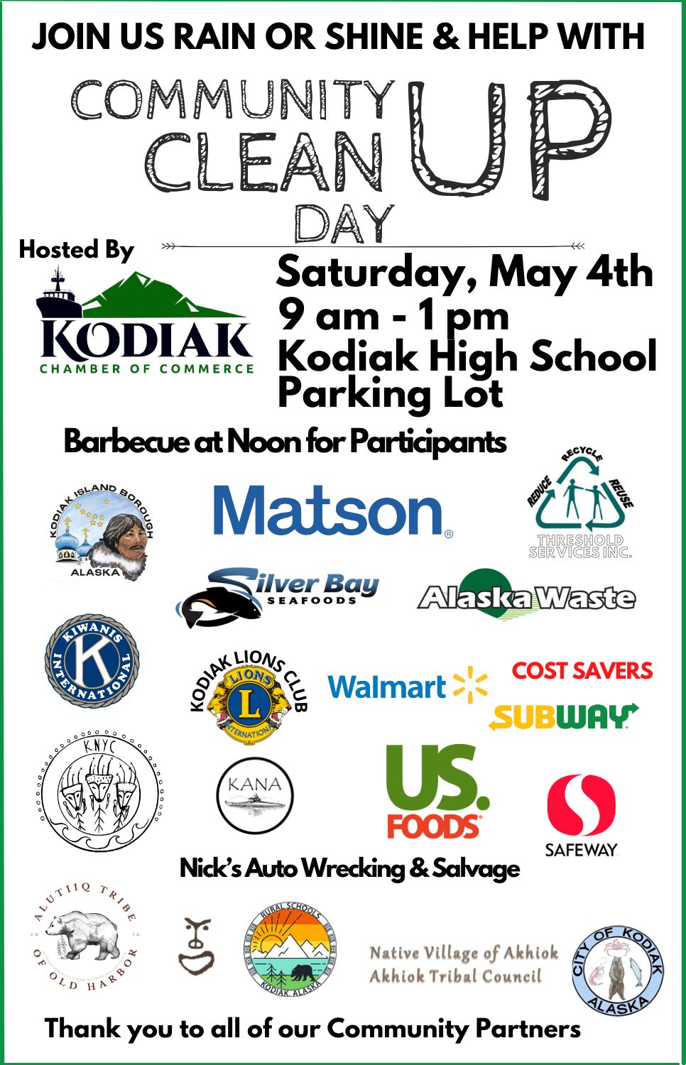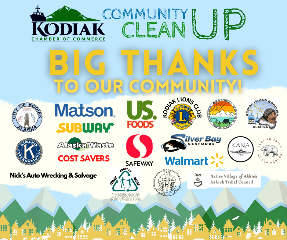 Thank you to everyone that came out and helped pick up trash this past weekend and to everyone that volunteered their time and made food donations for Saturday's Community Clean Up Day. Thank you to our Community Clean Up Day Sponsors: Matson, Silver Bay Seafoods, the Kodiak Island Borough, the City of Kodiak, Kodiak Lions Club, Kiwanis Club of Kodiak, Safeway, Walmart, Cost Savers, Subway, Threshold Services, Nick's Auto Wrecking & Salvage, Boy Scout Troup 626, Kodiak Rotary Club, Audubon Society of Kodiak, and Alaska Waste. Huge thanks to everyone that picked up the old mattresses, sofas, refrigerators, other large household garbage and old vehicle parts from our neighborhoods, up Pillar Mountain and in Monashka. The saying It Takes a Village is so very true when it comes to Community Clean Up. This year the Chamber partnered with the KANA Native Youth Council for Community Clean Up Day. These students have been hosting Village Clean Ups around the island since Earth Day, we look forward to updating you on what they were able to accomplish.
