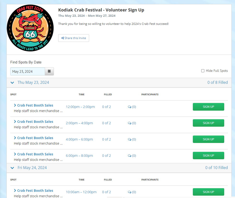 The 66th Annual Kodiak Crab Festival is just a little more than 2 weeks away and we are excited! We have over 60 Vendors signed up, parade and event registration is still open. We are selling Crab Fest Merchandise and Raffle Tickets online, in our office and of course at Crab Fest through Memorial Day. Our raffle ticket winners will be drawn at our CrabFest Booth starting at 3pm on Monday, May 27th.