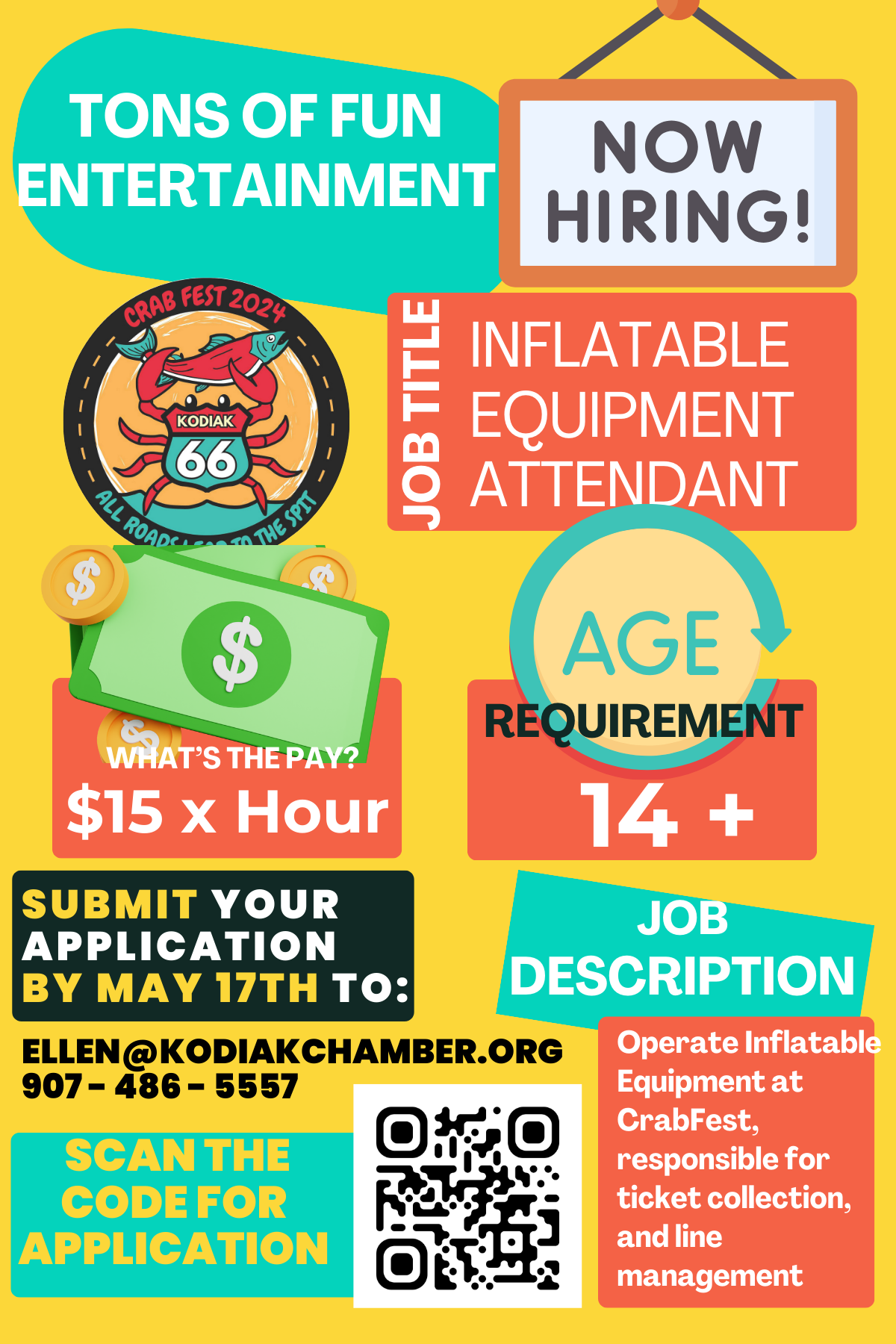 $15 an hour. Turn in Applications to Ellen at the Chamber office or email ellen@kodiakchamber.org. Click Below for More Details