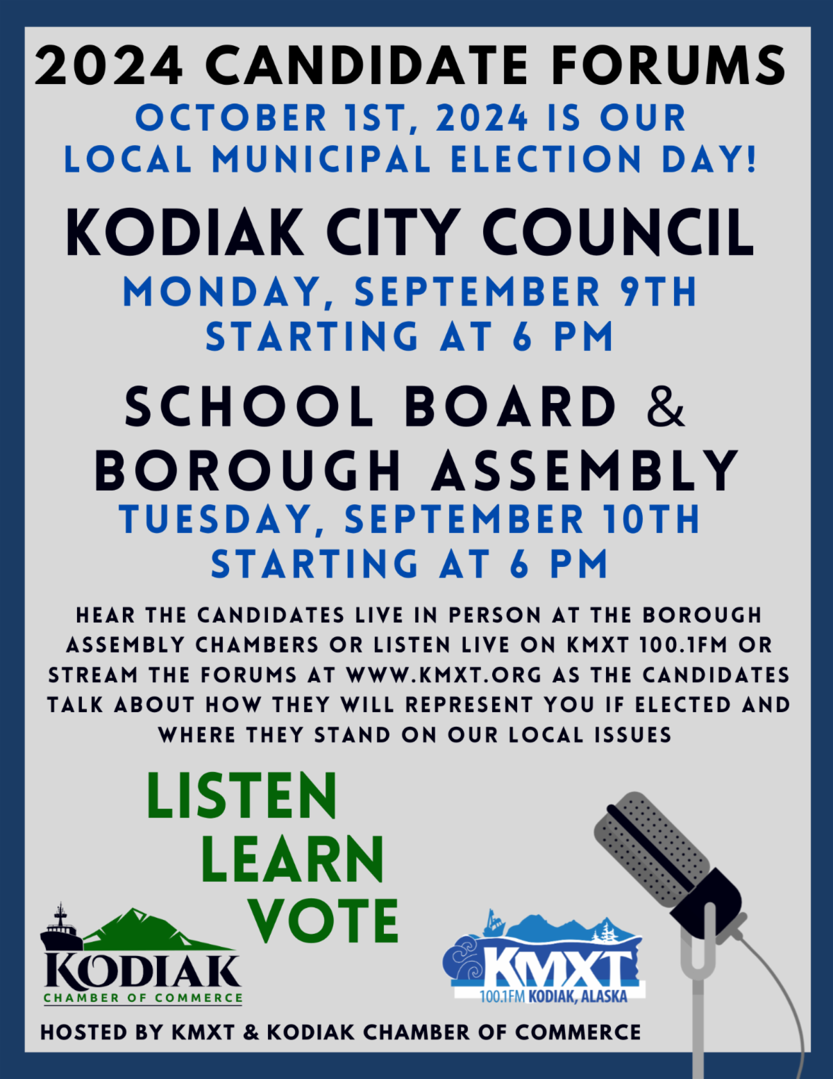 With our local municipal election on Tuesday, October 1st and early voting starting on September 16th, next Monday & Tuesday we are hosting Local Candidates Forums in the Borough Assembly Chambers with KMXT. The forums will be broadcast on 100.1 FM KMXT, streamed at www. kmxt.org and you are of course invited to listen to the candidates in person each night.