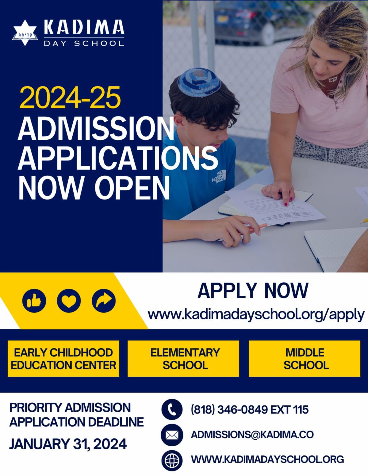 Admission applications are now being accepted for the 2024-25 school year. Remember, you do not need to reapply annually for admission. For priority consideration for younger siblings, please submit Kadima admission applications by January 31, 2024. Please visit your FACTS portal to apply, or click here.