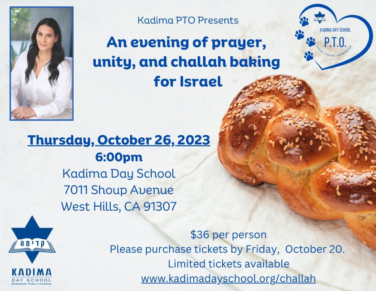 Kadima's PTO invites the Kadima community to a special evening of prayer, unity, and challah baking for Israel. The event will be lead by Sivan Kobi of Sivan's Kitchen and mother of a Kadima alum. Tickets are $36 per person. Limited tickets are available, deadline to purchase tickets is Friday, October 20. Please click here or on the flyer for tickets.