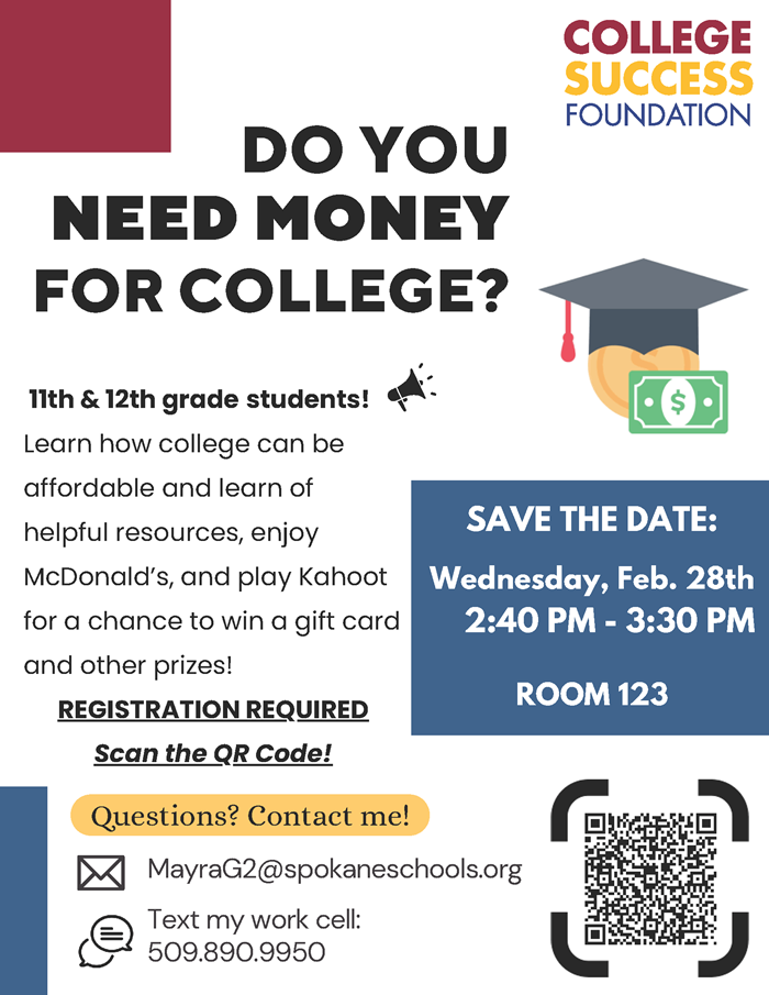 Rising Juniors and Seniors - if you are interested in doing Running Start next year, please join us on Monday, March 18, 6:00-7:00pm for an important information night. We will have representatives from the Community Colleges oof Spokane and Eastern Washington University to talk about their programs.