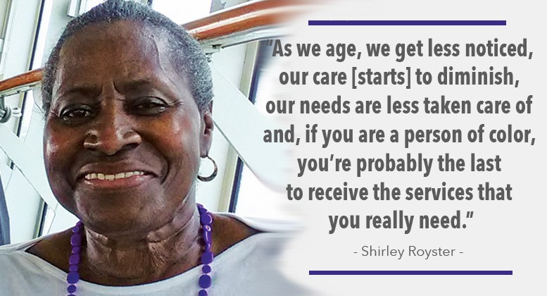 Shirley Royster: I think some of the issues are getting quality care. We … will be needing assisted living programs [and] assisted care to stay in our homes. ... Right now [in many assisted living facilities] if you are out, a lot of times you are [sat] in a corner, no one bothers you, no one wants to assist you because you are this gay person. And [being] gay is looked down on, even [among] seniors as it is … young people. (Mike Givens and Nicole Collins, The Rainbow Times, 5/30/18)