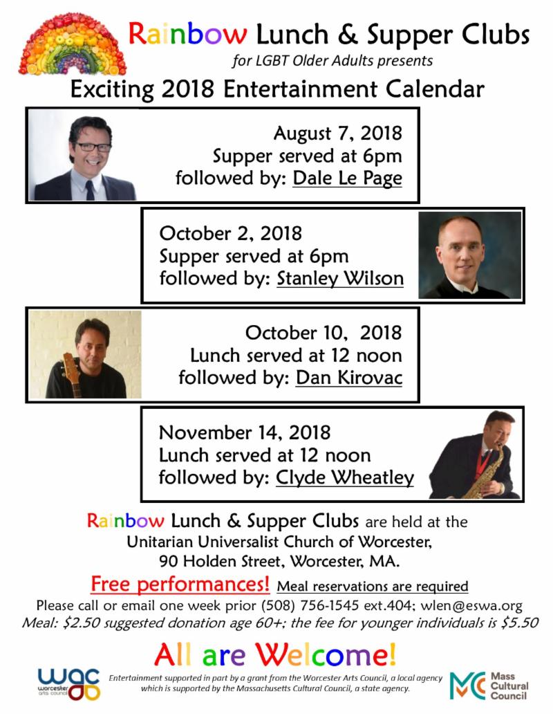 Reservations: If you wish to attend the Rainbow Lunch or Supper Club or cancel your reservation, please call or email WLEN one week before at (508) 756-1545 ext. 404 —
