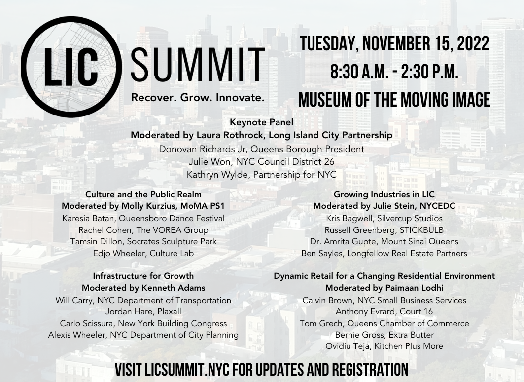 Join us as we discuss the unique qualities that have kept Long Island City resilient through COVID-19, investments in physical and social infrastructure needed to maintain momentum, and how LIC can be a model for New York’s economic recovery. Questions? Please contact Bari Lasky at blasky@licpartnership.org.