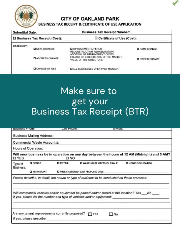 Did you know? Since 2019, all NEW businesses in Oakland Park are required to obtain a Certificate of Use and a Business Tax Receipt. Business Tax Receipts are good for one year and can be renewed online. Click here for details.