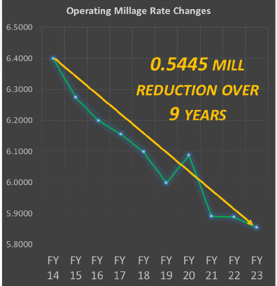 The millage rate is going down again! Following the adoption of the rates for the 2023 fiscal year at the September 21st Commission Meeting, the operating millage rate was decreased to 5.8550 from 5.8890 mills. This is the lowest millage rate for Oakland Park in over a decade and the eighth time the City has lowered the rate in the past nine years. Since FY 2014, the City has reduced the millage rate by 0.5445 mills, saving taxpayers over $10 million. The budget for FY23 includes more than $30 million for Capital Improvement Projects and funding for more than 150 initiatives to support public safety, infrastructure improvements, financial stability, and parks and leisure activities.