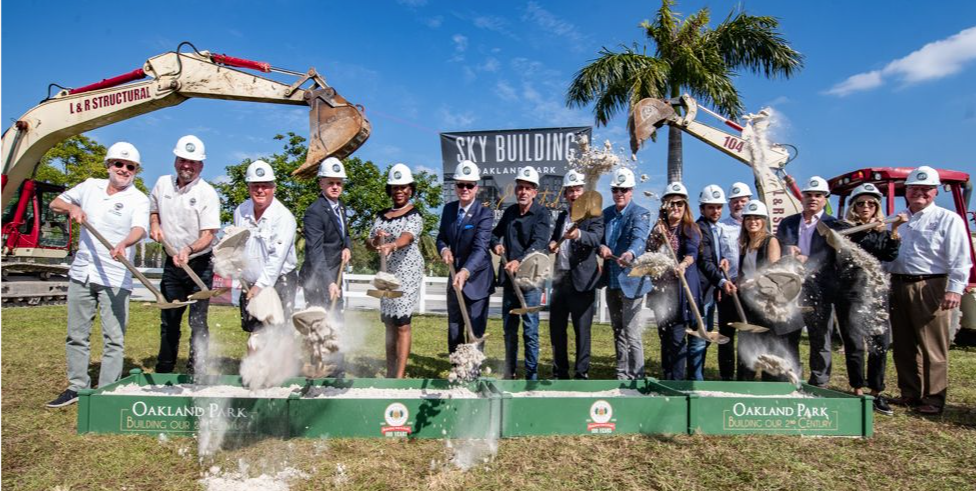 The future home of Oakland Park’s City Hall, the Sky Building project on North Dixie Highway, broke ground on Monday. The Sky Building is an innovative public/private partnership between the City and developer NR Investments and represents $48 million in private investment in Oakland Park. The City will move operations to the west side of Dixie Highway and serve as a landmark tenant in the mixed-use development that will also include residential units and ground-floor retail. Moving City Hall is part of an effort to relocate services to the west side of Oakland Park to strike a greater balance of operations where more of the City’s population resides. The signature Sky Building will overlook Jaco Pastorius Park and become the new civic, commercial, and entertainment heart of Oakland Park.