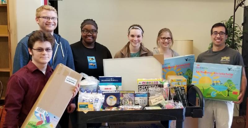 {Pictured (L to R) with a delivery of supplies are Purdue math education students: Aaron Schlossberger, Mitchell Sutton, Namaluba Malawo, Ashton Knies, Rachel Adduci, and Cuitla Alaniz; and not pictured are Professor Jill Newton and students, Morgan Horter & Tyler Long.}