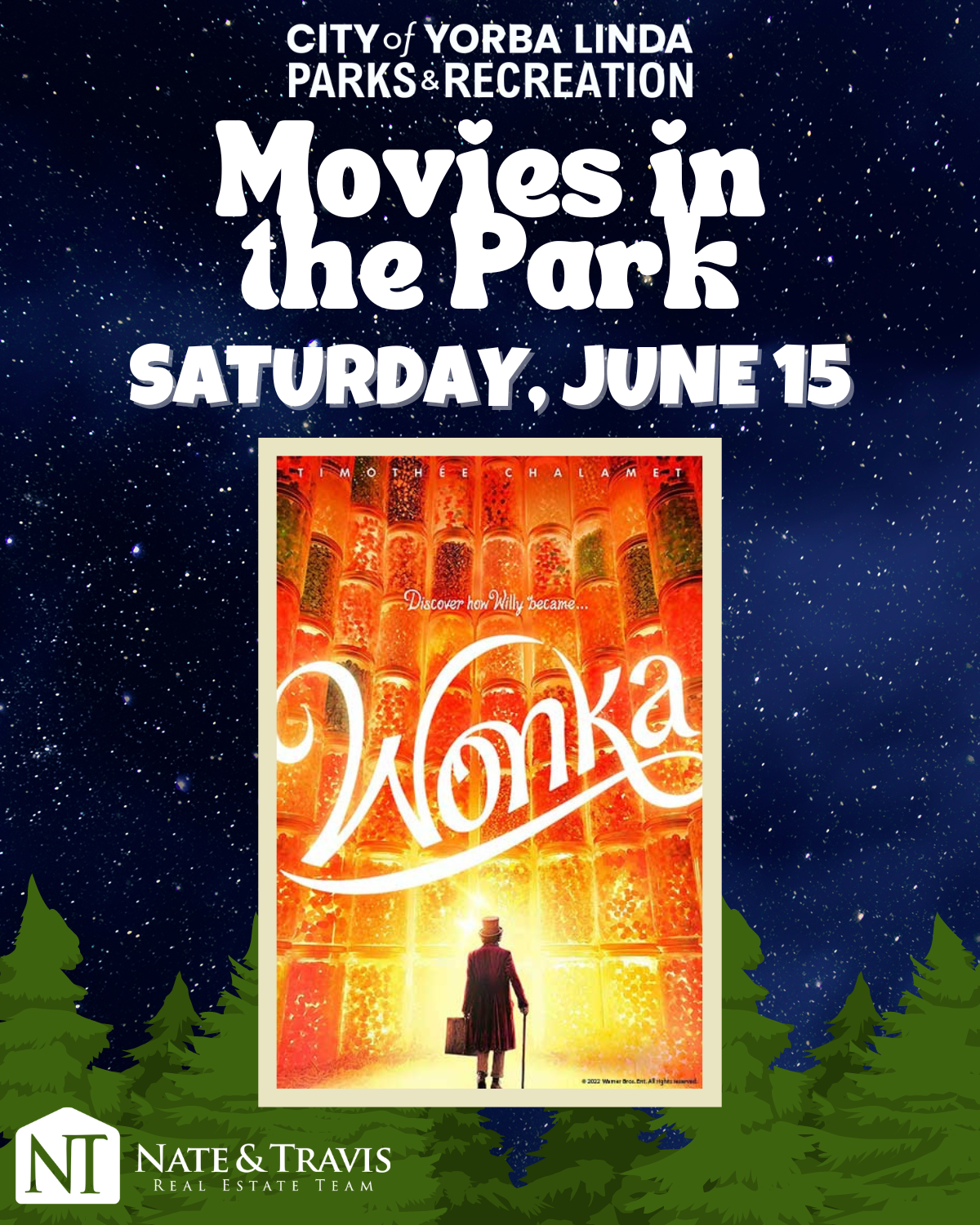 | Come join us at Hurless Barton Park to enjoy a special showing of Wonka. Enjoy a Saturday evening in the park while watching a family-friendly movie on our 20ft inflatable movie screen. No pre-registration required. Make sure to bring a blanket or lawn chair for seating and some snacks! The movie will start at dusk; approximately 8 p.m. | |