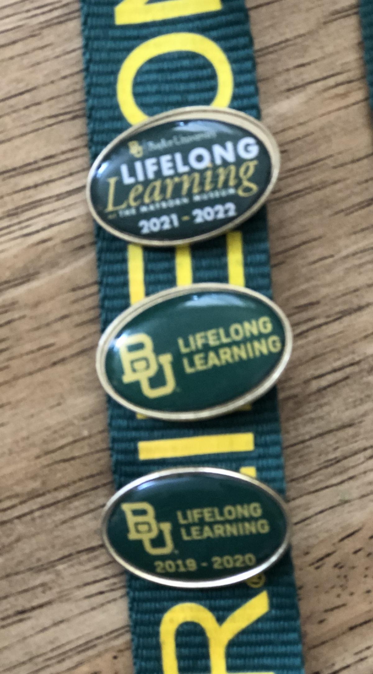 What’s not to love about volunteering with Baylor Lifelong Learning? With the continuing plan to award annual volunteer pins to those who serve, any interested member can add a volunteer pin to his or her lanyard each year to share with others that they, in one way or another, make it possible for us to continue to offer great programming and activities for curious senior adults in Central Texas. Will you consider becoming a Lifelong Learning volunteer?