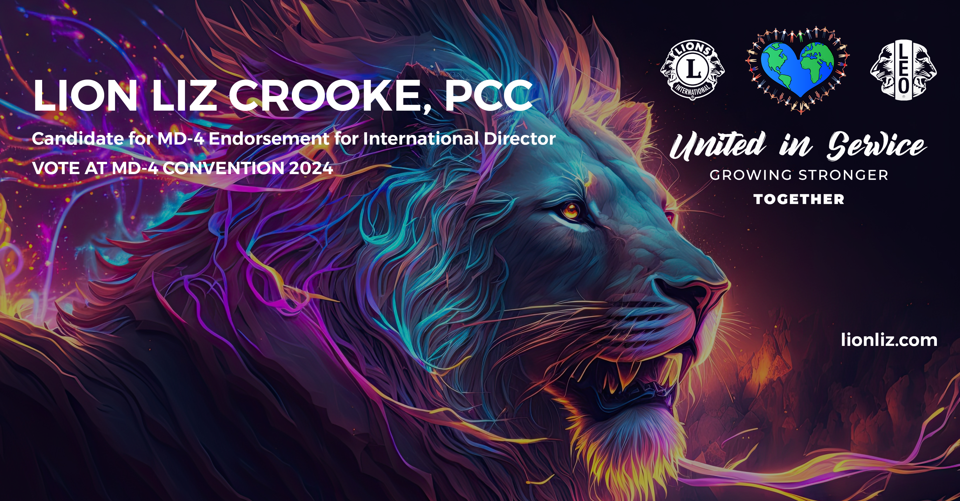 Learn about Lion Liz Crooke, PCC, candidate for the MD-4 endorsement for International Director, Lions International. | | | |
