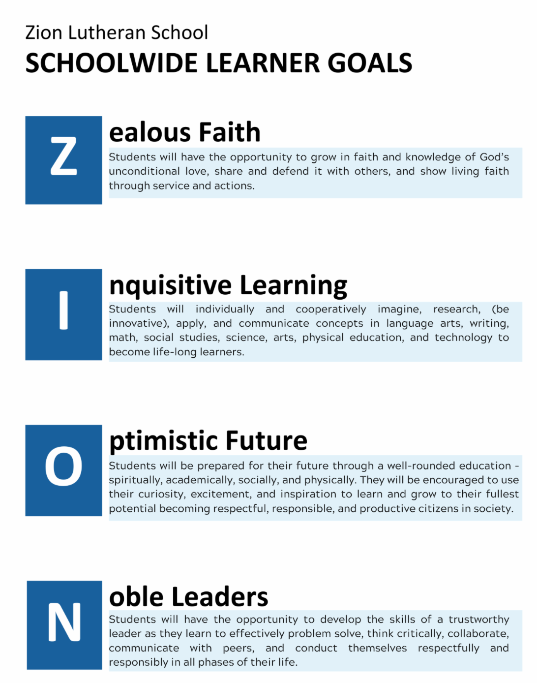 The Zion Principal Call Committee would like to provide an update on our progress to ensure we select the candidate God has chosen for our school ministry. As committee members, we understand that we are not acting on our behalf, but as representatives and servants of the entire congregation. We were chartered to do this work on behalf of the congregation, and have gone about this important business diligently, thoroughly, and confidently, seeking the Holy Spirit’s guidance and using the gifts God has provided us to arrive at a God-pleasing recommendation. After being in earnest, consistent prayer, the call committee is pleased to announce that we are formally recommending Nichole Perez to the Board and our members to serve as our next Principal here at Zion Lutheran School Anaheim. A special congregational meeting will be held on Sunday, May 19 in between church services to discuss and vote on a call for Mrs. Nichole Perez.