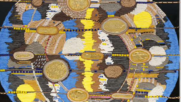 Image: Stream of Consciousness, 2024 (silicone, foam clay, acrylic paste, varnish, beads, acrylic nails, mosaic stones on wood board) by Theresa Weber,