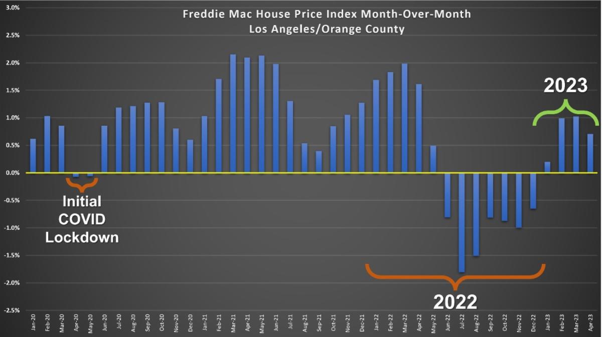 It is time to push the emotions aside and consider the facts, basic economic principles, and irrefutable data. According to the Freddie Mac Home Price Index, home values in the Los Angeles/Orange County region dropped by only .01% in March and April of 2020 during the initial COVID lockdown. They then reversed course and rose consistently for the remainder of 2020. In 2021, home values rose by 2% or more monthly from March through June. This level had only been achieved since the turn of the century in April and May 2002, April and July 2003, from February through May 2004, March through May 2005, and March through May 2013. Only 15 months out of 243 months before the pandemic. It occurred again in March 2022, five times in total in just two years.