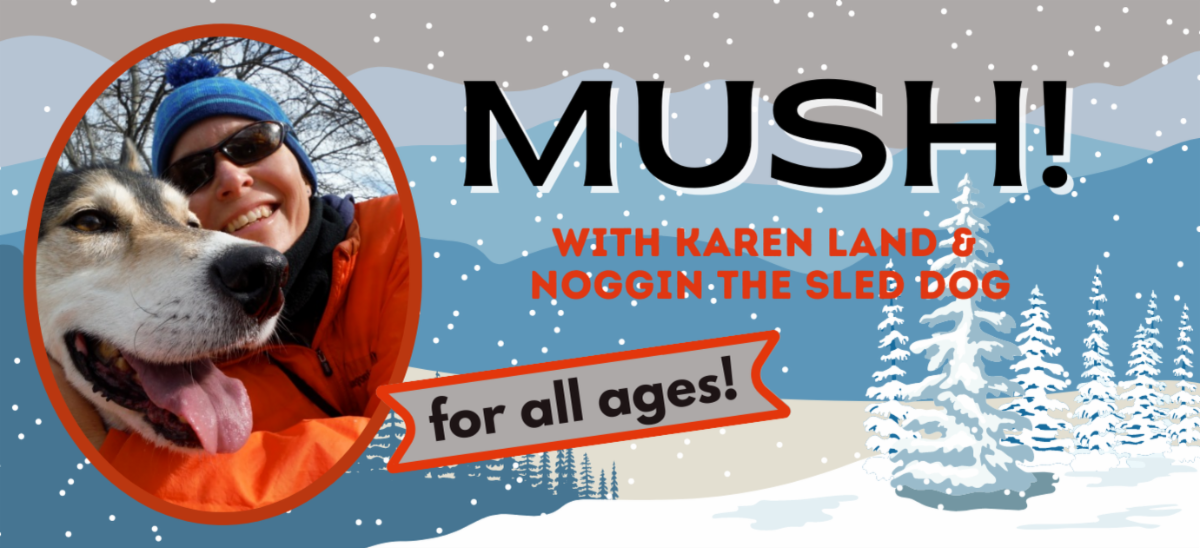 Musher Karen Land will answer these questions and more when she and Noggin, the Alaskan husky, visit us on Tues., March 28 at 6:00 p.m. Land is a writer, public speaker, and three-time participant in the 1,000-mile Iditarod Trail Sled Dog Race as well as many other sprint and endurance races in Alaska, Canada, Montana, Idaho, Wyoming, and Maine. Since 2000, Land has traveled to nearly every state with her Iditarod dog sled, mushing gear, Arctic clothing, and beloved dogs, giving more than 1,000 school and public library presentations.