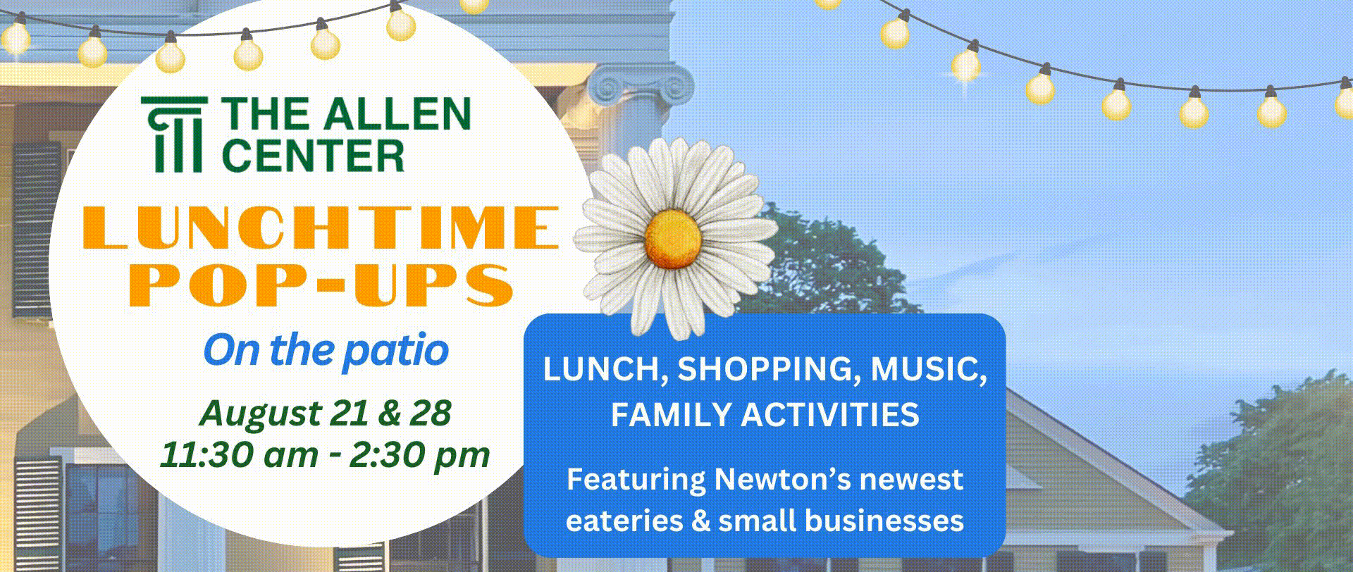 Never mind the back-to-school ads and the Halloween candy display at Star Market--there are still a few weeks of summer left and West Newton's Allen Center is gearing up to make the most of them. Yup, last summer's lunchtime pop-ups are returning to the Allen Center's gorgeous patio for two glorious days--Wednesday August 21 and 28.