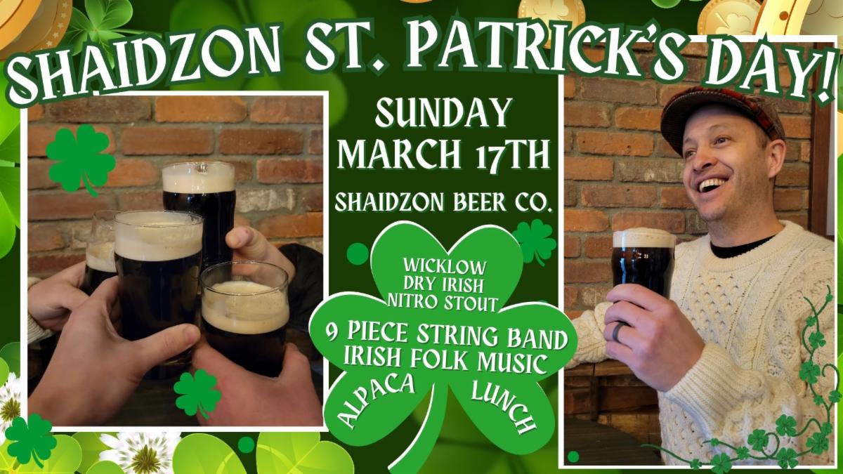 Join us at Shaidzon for a wondrous St. Patrick's Day celebration. We re-introduce our Wicklow - Dry Irish Nitro Stout! We welcome a 9-piece string band, Alpaca Lunch, playing Irish folk music and more! Wear green. Wear traditional Irish attire. Step dancing highly encouraged!