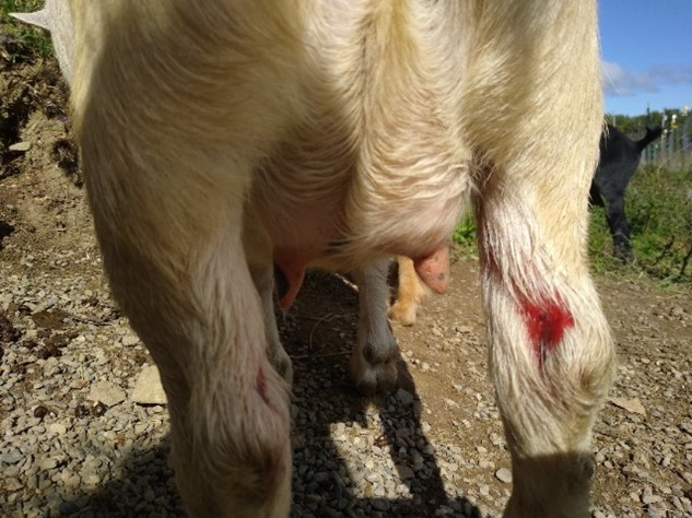 At about 6 months, our rotund, short, white doe Cassie showed up with wounds on her back legs. Being my first LGD, I had all the faith in the world in him. It did not cross my mind that this was his handiwork. I looked for things that could have caused this. Maybe she got caught in the rock pile and ripped up her legs trying to get out. A few weeks later she was injured again! That can't be the rock pile. A couple days later I was driving in and they were all in the field, running towards the barn. Don't you know, there was Custo biting at the slowest one, poor Cassie. | |