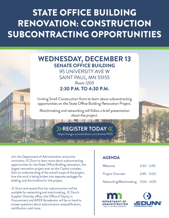 Join the Department of Administration and prime contractor JE Dunn to learn more about subcontracting opportunities for the State Office Building renovation, the largest renovation project ever on the Capitol complex.
