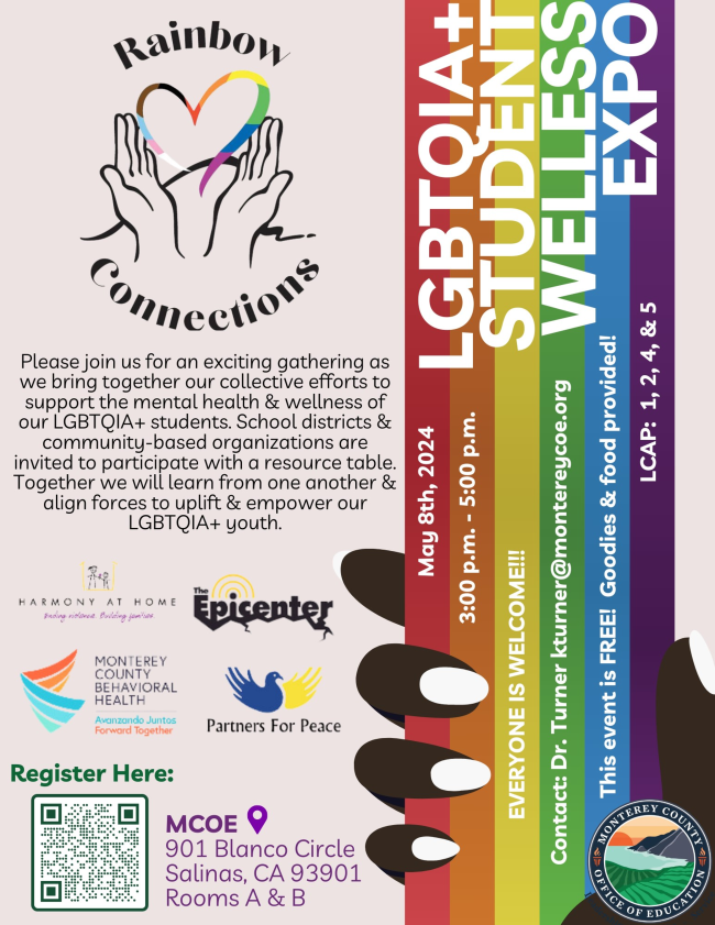 Please join RainbowConnectionsand MCOE for an exciting gathering as we bring together our collective efforts to support the mental health and wellness of our LGBTQIA+ students. School districts and community-based organizations are invited to participate with a resource table. Together, we will learn from one another and align forces to uplift and empower our LGBTQIA+ youth.