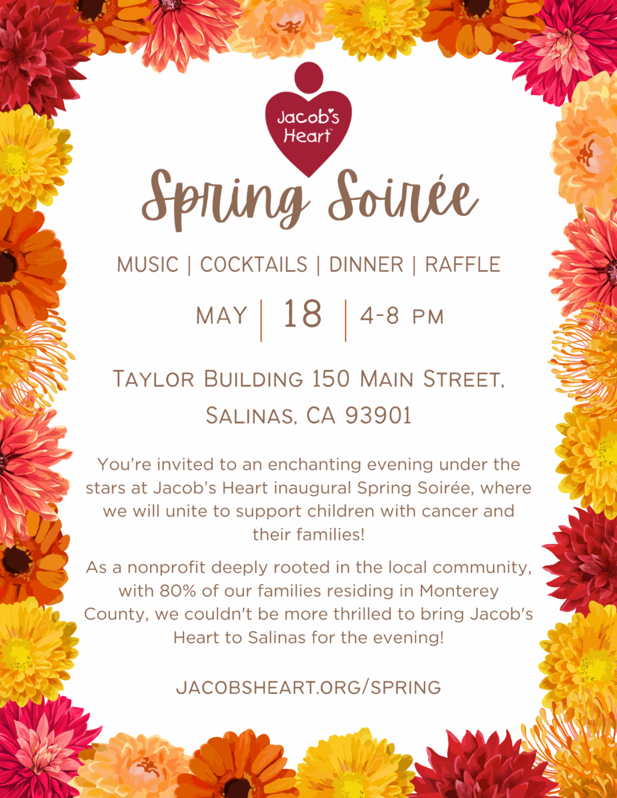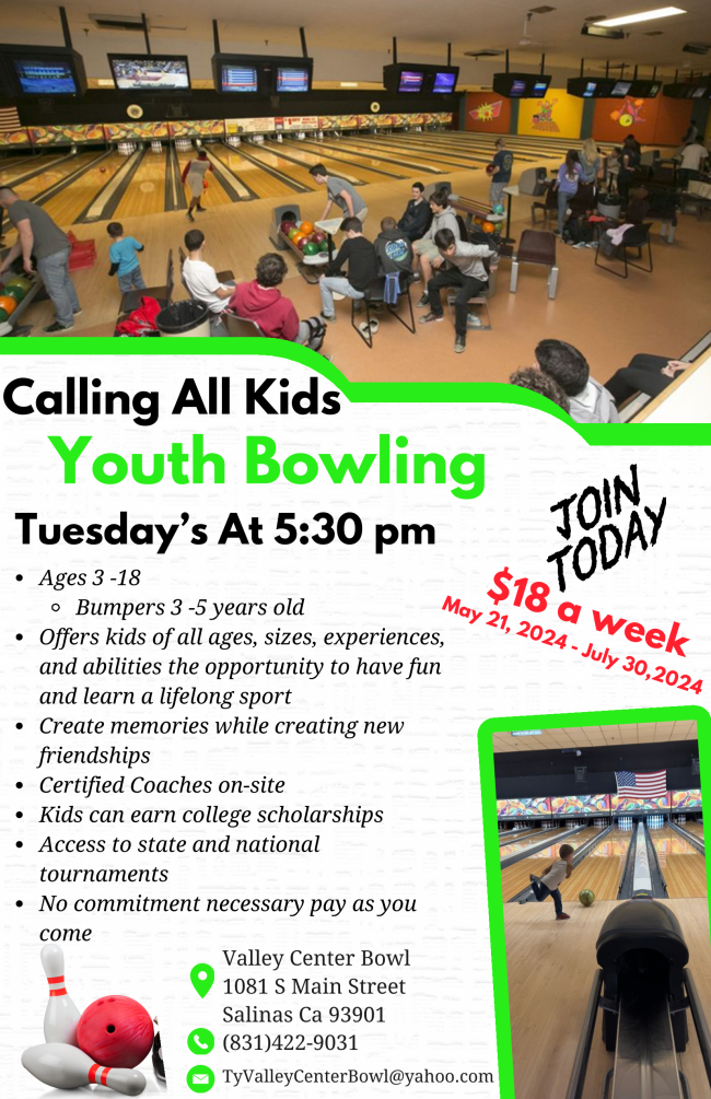 | The Valley Center Bowl Youth League is offering Tuesday bowling at 5:30 pm for $18 a week through the end of July. Learn more at tyvalleycenterbowling@yahoo.com. | Jacob's Heart Spring Soirée | Jacob's Heart Children's Cancer Support Services invites you to an enriching evening under the stars at Jacob’s Heart's inaugural Spring Soirée on May 18 from 4 to 5 PM, where they will unite to support children with cancer and their families. Learn more at Jacobsheart.org/spring. | |