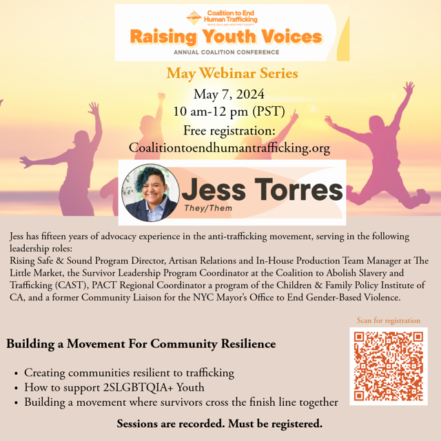 | Raising Youth Voices Webinar Series | The Coalition to End Human Trafficking is hosting a May Webinar Series. The first webinar will be held on May 7 from 10 a.m. to 12 p.m. Register at Coalitiontoendhumantrafficking.org. This is a great opportunity to learn how to recognize and prevent human trafficking and ways to support survivors. | |