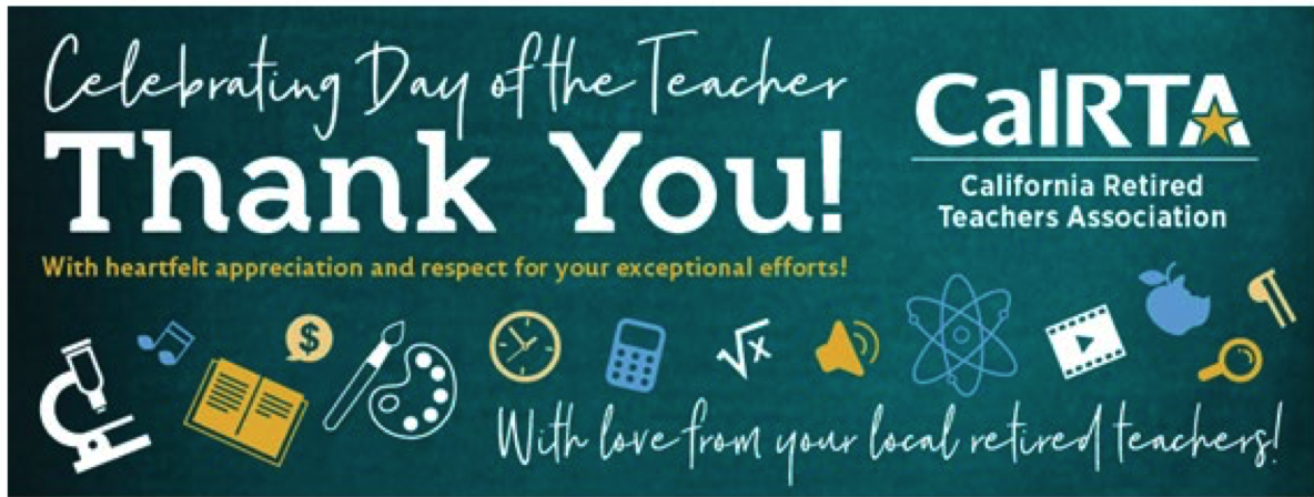 A message from CalRTA on the Day of the Teacher | The moment of retirement for educators who have been teaching for over 25 years will soon be realized; it will be a time for adjusting to a new routine, trying new interests, traveling, and sharing moments with loved ones. The most valuable consideration is the guaranteed pension that teachers will receive every month. California Retired Teachers Association's mission statement makes this possible: It is the only organization that advocates and protects your pension at the state and national levels. Consider becoming a member, as the strength of CalRTA's advocacy is in its membership. You can access CalRTA membership at calrta.org or email Evie Bolante at obolante@gmail.com. | | |