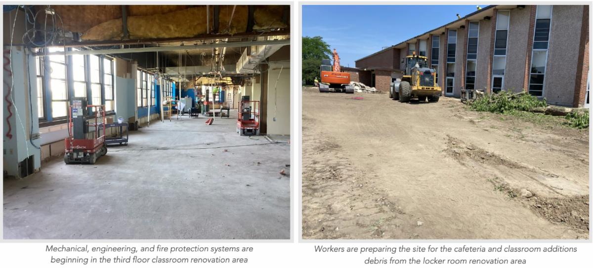 Since the first phase of construction began last month, crews are making abundant progress throughout the school this summer. Environmental and demolition work is complete in the classroom renovations on the third floor. In addition, workers have started site excavation for the cafeteria and classroom additions. In the new welcome center entrance, the foundation for a new elevator has been poured and the walls are being constructed. This new elevator will improve building accessibility for students, families, and visitors.
