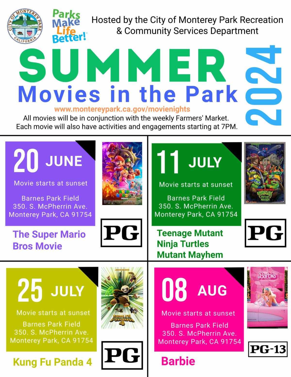 Upcoming screenings are on July 25 with Kung Fu Panda 4" (PG), and August 8 with "Barbie" (PG-13).