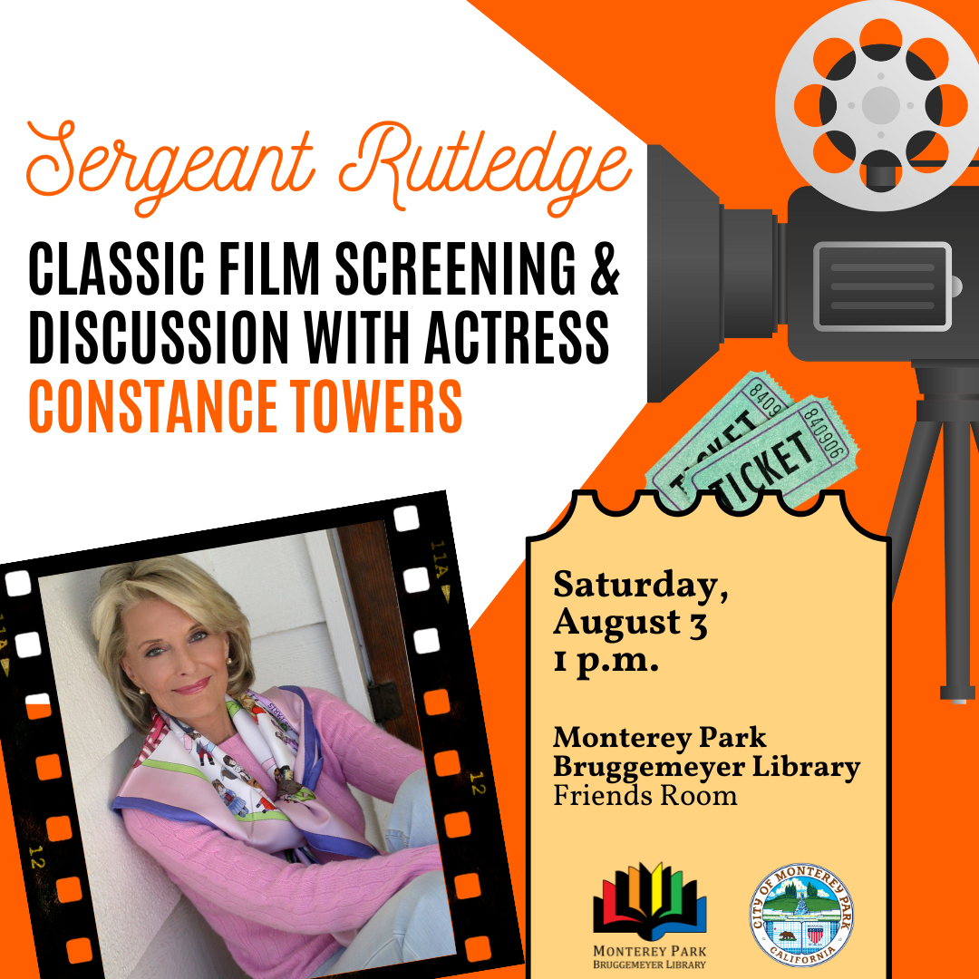 Film enthusiasts are invited to a special screening of the John Ford classic, “Sergeant Rutledge,” at the Monterey Park Bruggemeyer Library on Saturday, August 3 at 1 p.m. After the movie, film historian Foster Hirsch will lead a discussion with the star of the film, Constance Towers and Christopher Hunter, son of the film's co-star, Jeffrey Hunter.