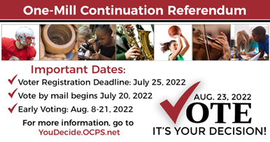 Orange County Voters: a referendum on the continuation of the One-Mill Ad Valorem Special Millage is on the August 23 primary election ballot. For more information visit http://youdecide.ocps.net.