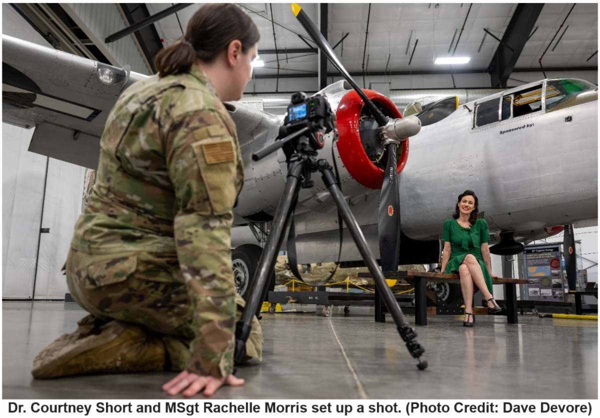 The video of the current 310 SW is being produced and directed by the unit's historian, Dr. Courtney Short. She and her Schriever Public Affairs crew of Master Sergeant Rachelle Morris and Technical Sergeant Devon Cole shot three segments in the Museum, all to tell about the Japanese attack on Pearl Harbor, the response by B-25s of the Doolittle mission, and the effect of the raid on Japan itself and on American morale. The segments will be merged with others to tell the story of the original 310 BG, how it fits into the big picture of WWII, and how all that has led to the present 310 SW.